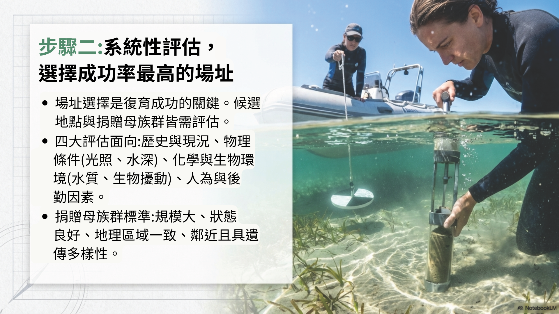 2. 並從眾多復育方法中選擇與其特定場域及物種相匹配的技術。