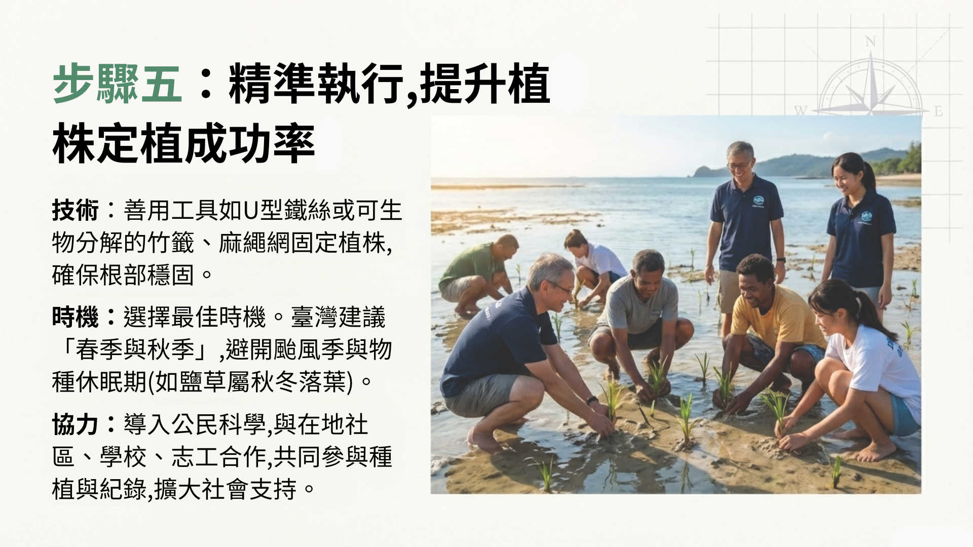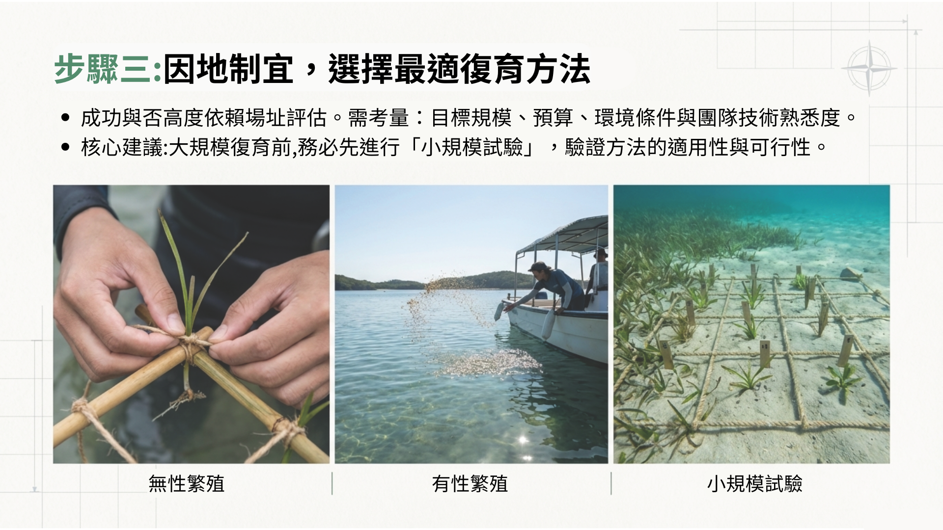 綜觀過去幾十年的全球海草復育研究,歸納出以下六項原則,被認為是指導海草復育活動的重要考慮因素