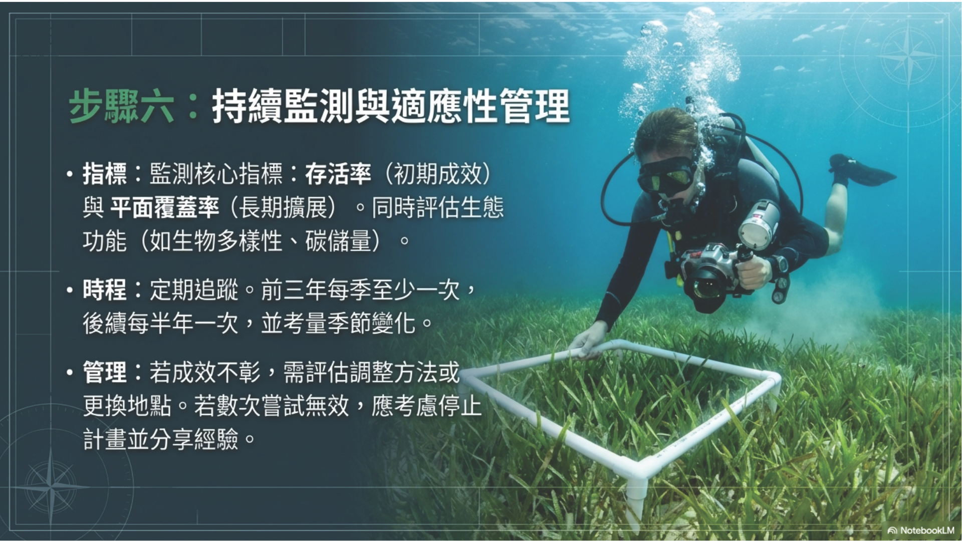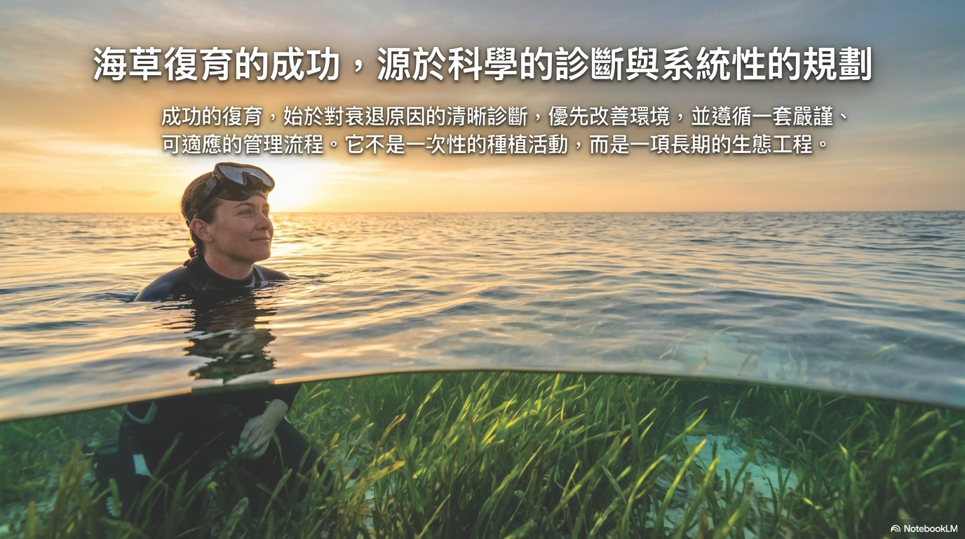 - 當前,海草生態系面臨沿岸開發與氣候變遷的壓力,導致覆蓋率下降,因此未來復育策略需依據各地物種與環境特性,發展適地適種的管理方式,以提升其生態韌性。