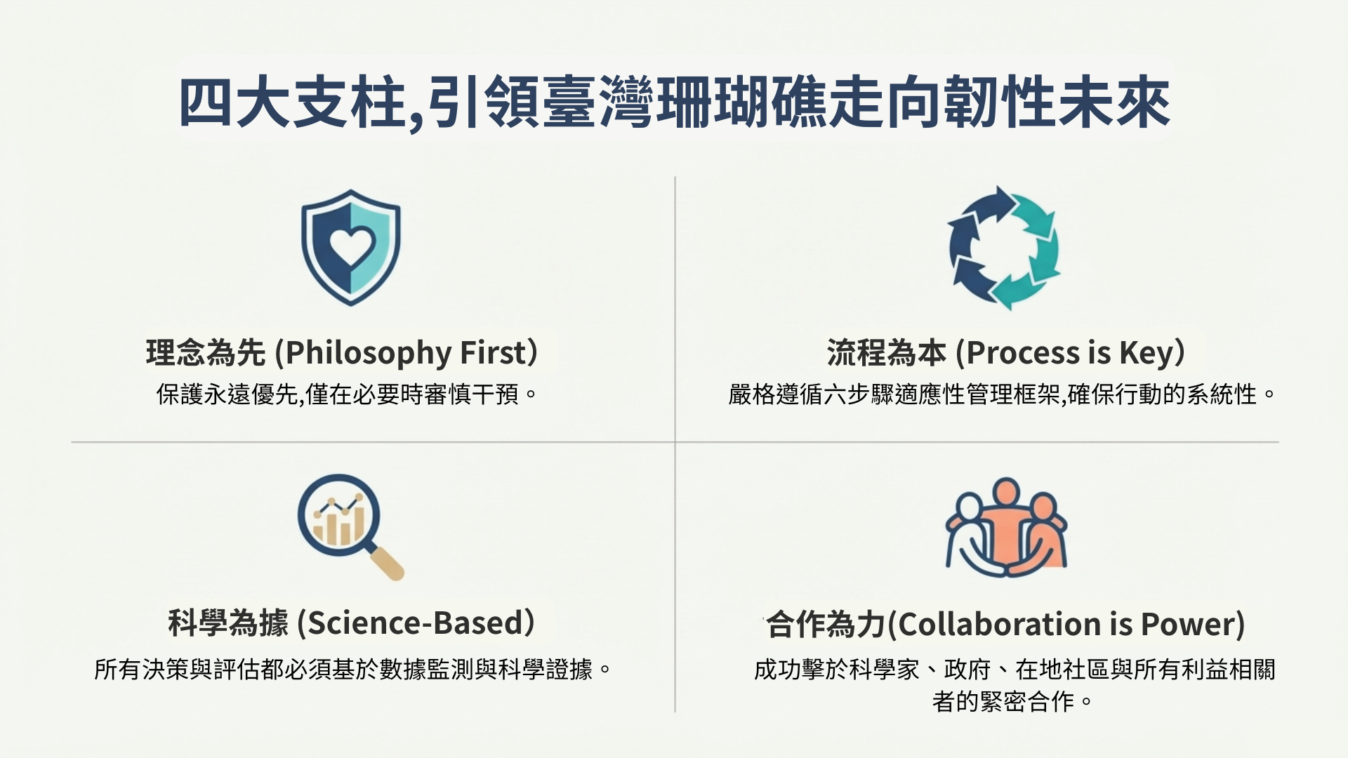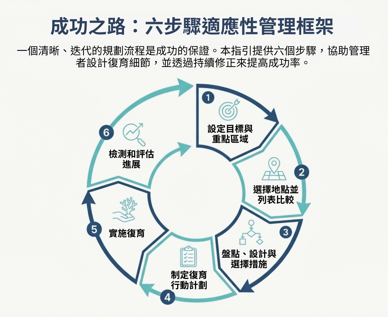 二、 本指引目的為協助規劃珊瑚礁復育計畫,提供適應性管理方法,以提高成功率和持續修正能力。透過系統性的步驟,管理者可以制定清晰的計畫並有效執行。同時搭配《海洋保育法》第 20 條海洋生物復育措施辦理原則相關子法,使珊瑚礁生態復育工作有明確之法令依據。