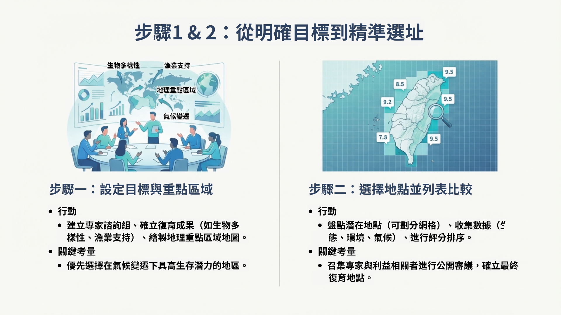 (二) 珊瑚礁復育(Coral Reef Restoration):通過人工手段恢復退化珊瑚礁生態系統的結構、功能及服務的過程,旨在提升其生物多樣性、生態韌性及長期存續能力。