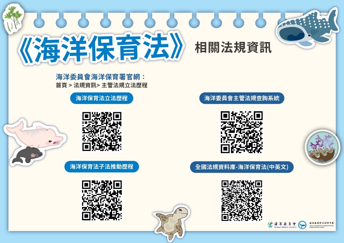 海洋保育法自114年7月1日全面施行 一、背景說明       臺灣四面環海,海洋資源豐富,擁有發展海洋得天獨厚的天然環境。為打造我國成為生態永續、海域安全、產業繁榮的優質海洋國家,政府於107年4月成立海洋委員會,作為海洋政策...